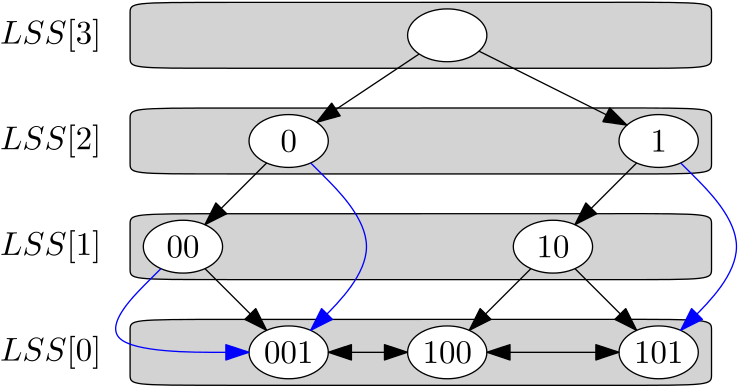 首先,我们先建立一颗普通的01字典树,这个树我们对他稍作修改,考虑到字典树的节点分3类: 叶子节点、根节点、内部节点,我们让叶子节点间构造双向环状链表,其次,对于仅有左儿子的内部节点,让其右儿子指向子树的最小叶子节点,对于仅有右儿子的内部节点,让其左儿子指向子树的最大叶子节点。另一方面,我们对字典树的每一层都建立一个hash表,hash掉他们节点所代表的值是有还是没有,这样我们就构造出了一个X快速前缀树的模型了。
