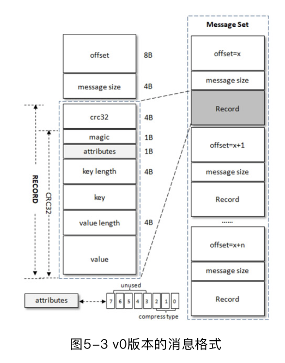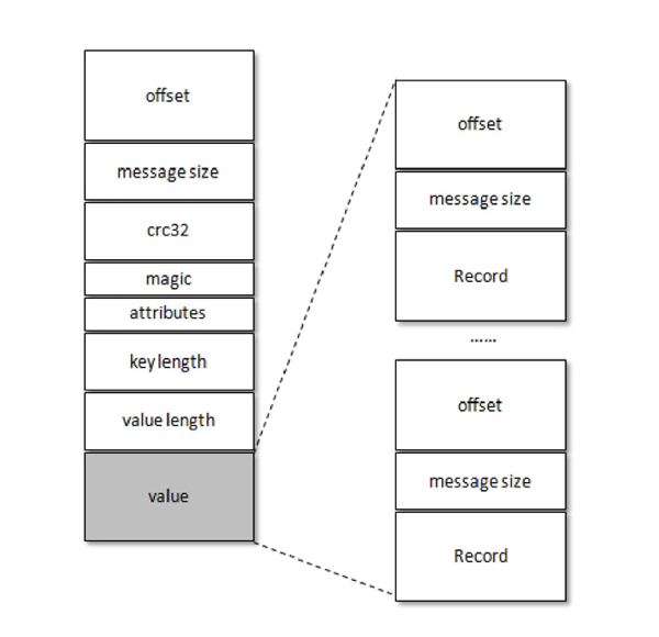右边是消息集,每个Record是一条消息,offset是偏移量,messagesize代表消息的长度。