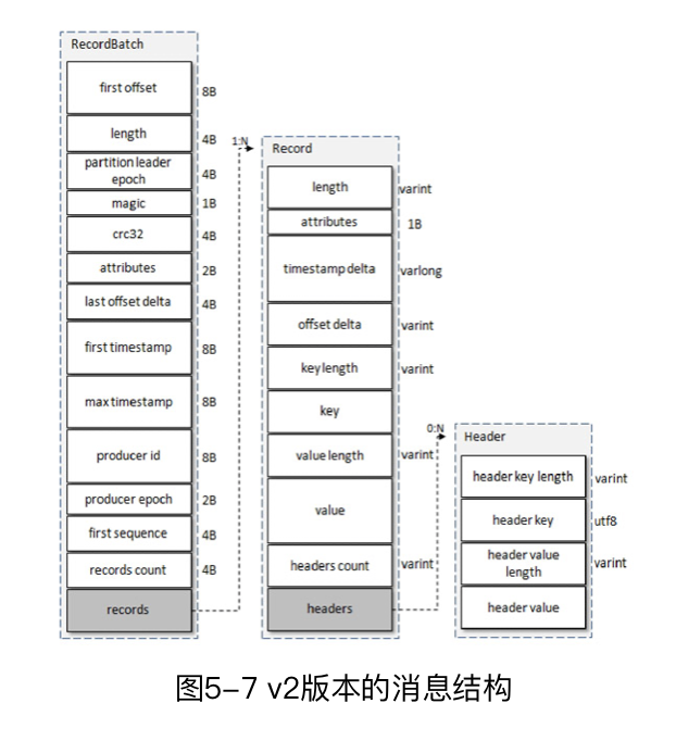 在v2版本中,message set改名为recordBatch,他也拥有了自己的头,在recordBatch中包含了多个record,其中的每个record与v1版本并无太大差异,我们注意到,他使用了大量的varint和delta,这个意思是很多数据是基于recordBatch中数据的相对值,这也导致了这些数往往很小,所以varint能发挥它最大的作用。