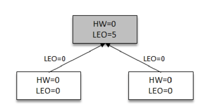 1. 先来看一个状况,这里灰色broker为leader,此时follower向leader发起同步请求,并携带自己的LEO,leader会根据请求的LEO更新自己的HW,当然这是第一轮,还不需要更新