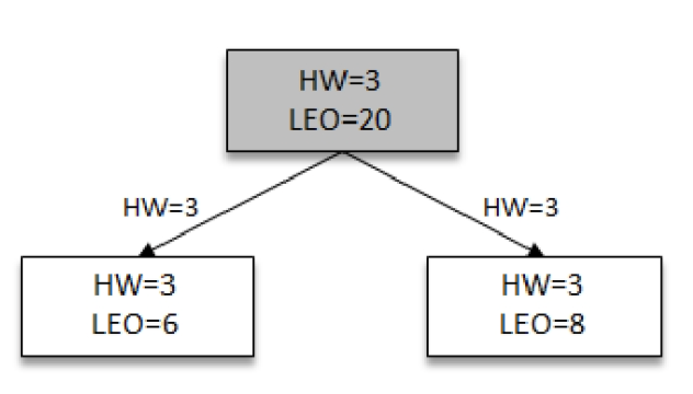 我们注意步骤3过后,步骤4以前,leader的HW要比follower高,除非leader回复follower的同步请求。