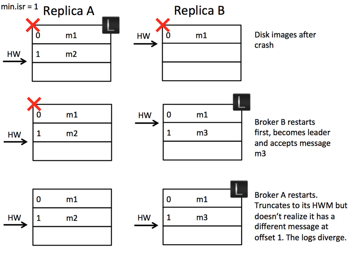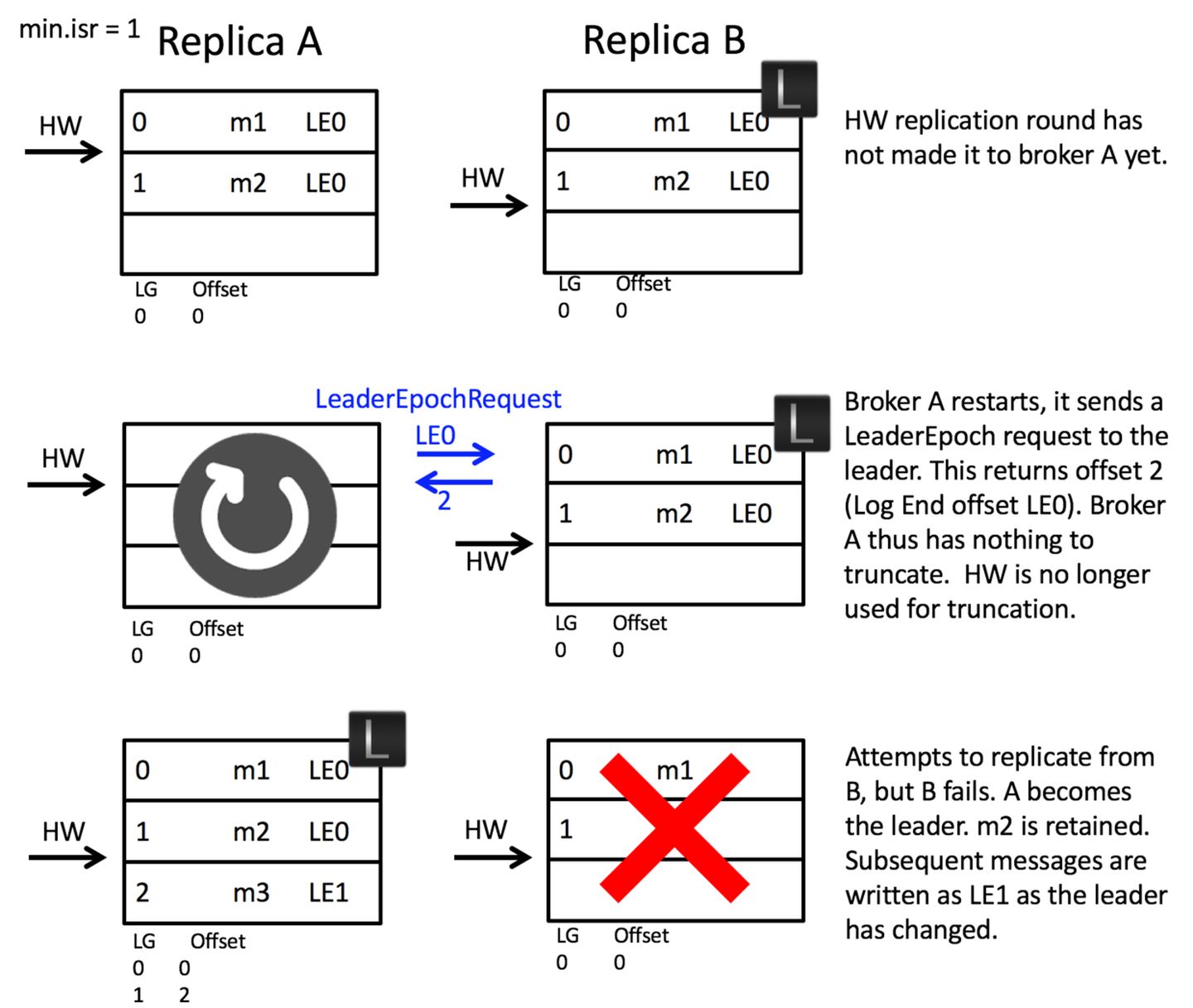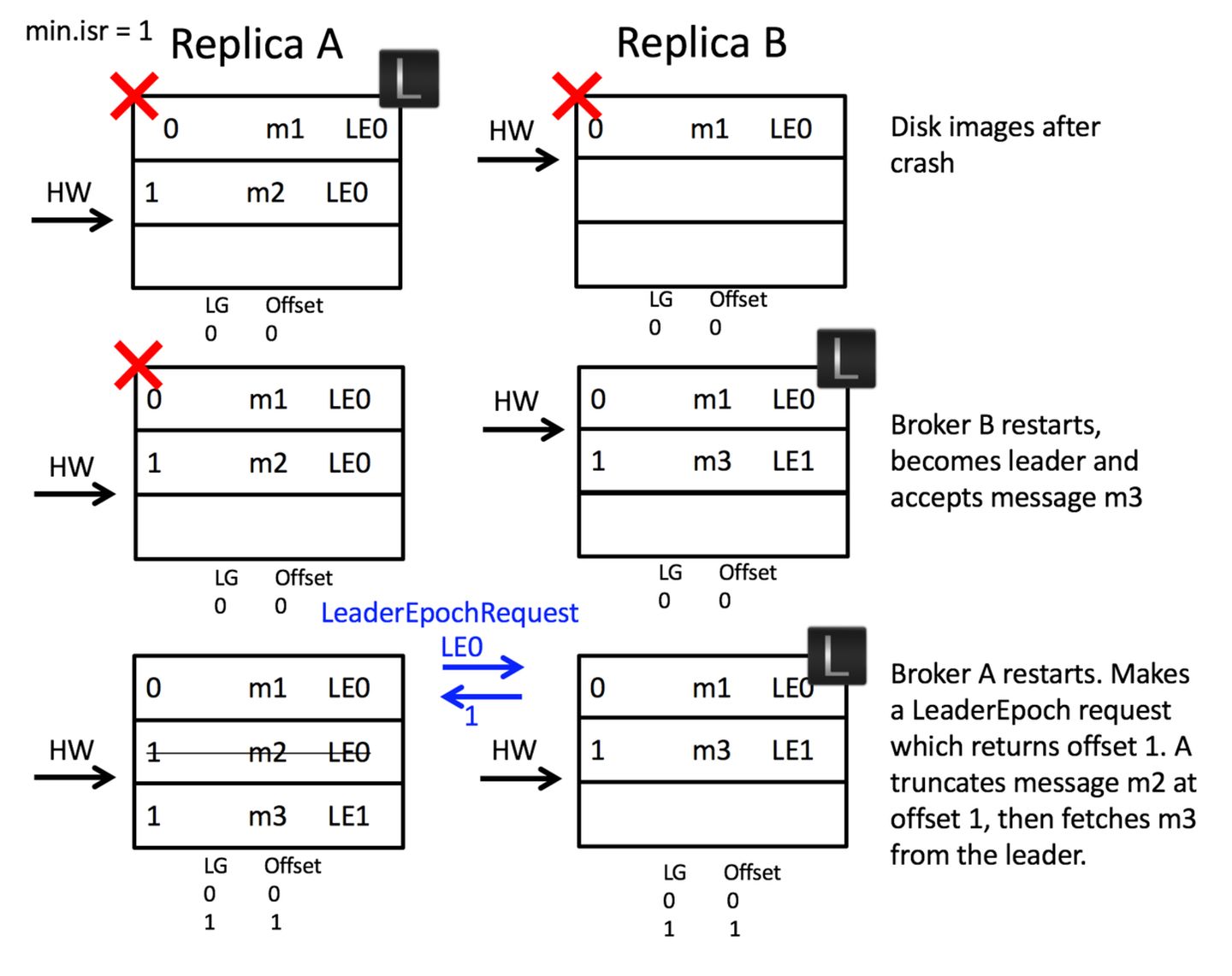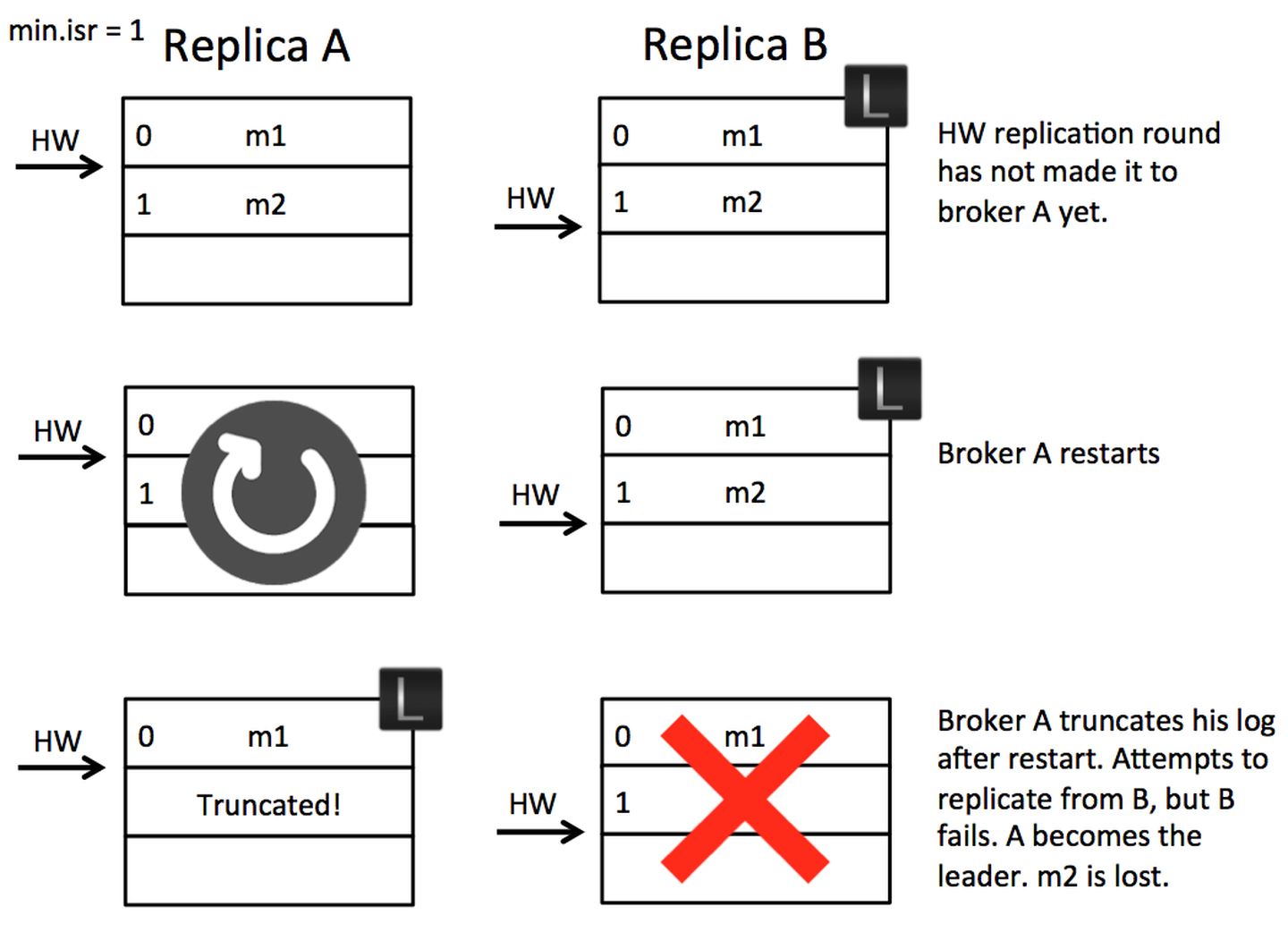 假设有A、B两个Broker,初始时B为leader,A从B中取到消息m2,所以A中有消息m2了,但是由于在下一轮RPC中,A才会更新自己的HW,所以此时A的HW没变。如果这时候A重启了,他截取自己的日志到HW并发送一个fetch request到B。不幸的是,B这时宕机了,A成了新的leader,那么此时消息m2就会永久的丢失了。