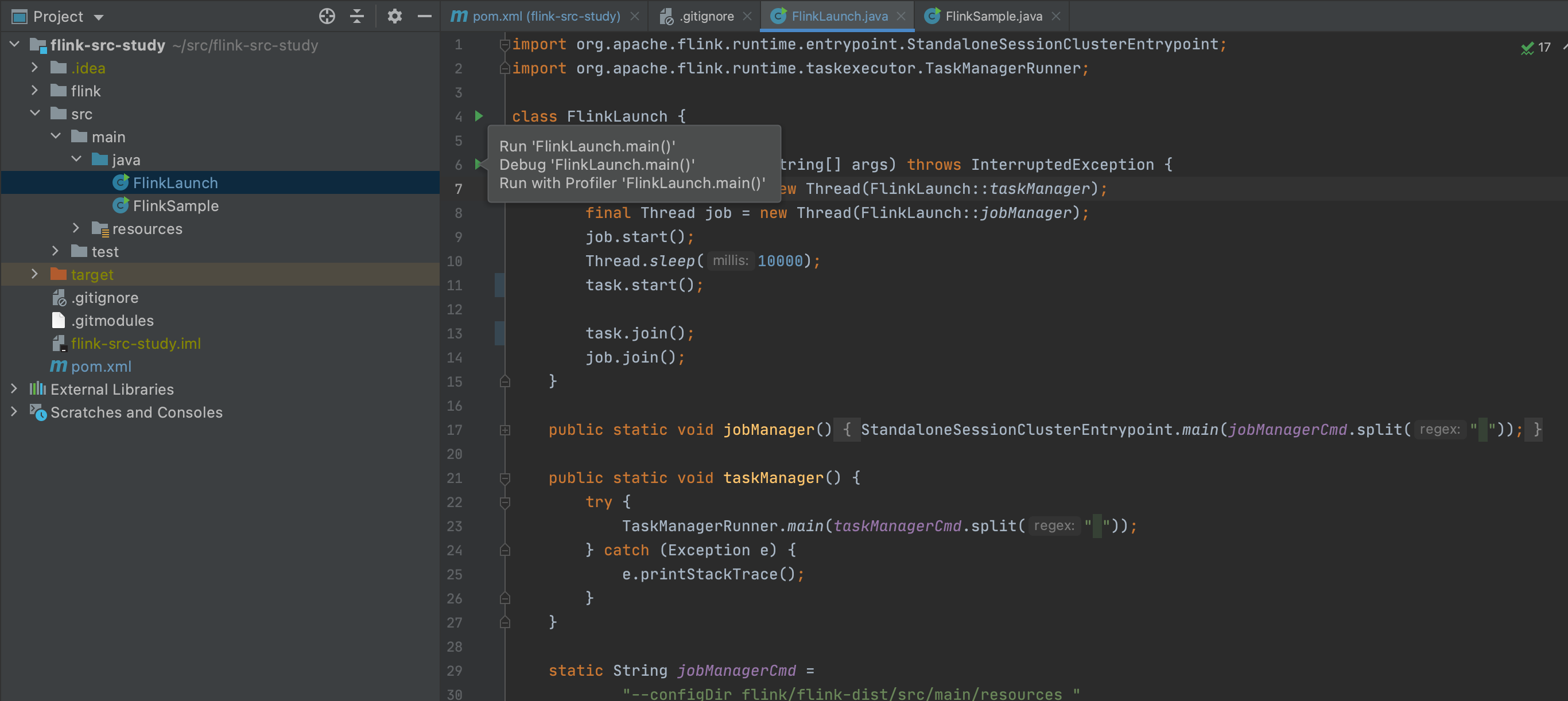 在这个项目中,笔者把flink源码作为了一个git submodule放置于文件夹flink中,用来临时查看,当然我个人不建议看这些代码,因为这个文件夹太大了,IDE都不能很好的处理他。