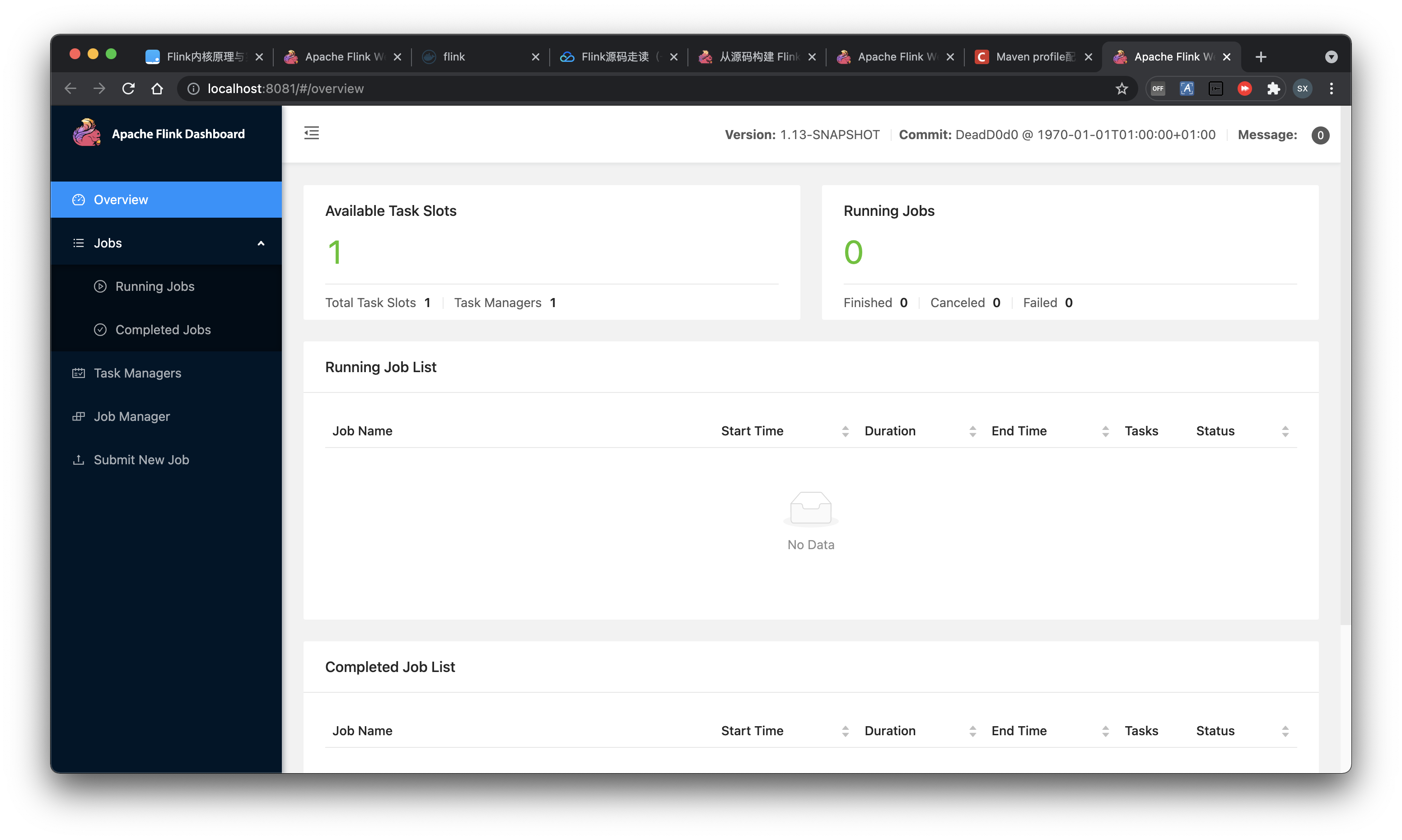 现在你可以直接从这里进入flink的控制台http://localhost:8081, 你也可以直接在ideal中调试flink。
