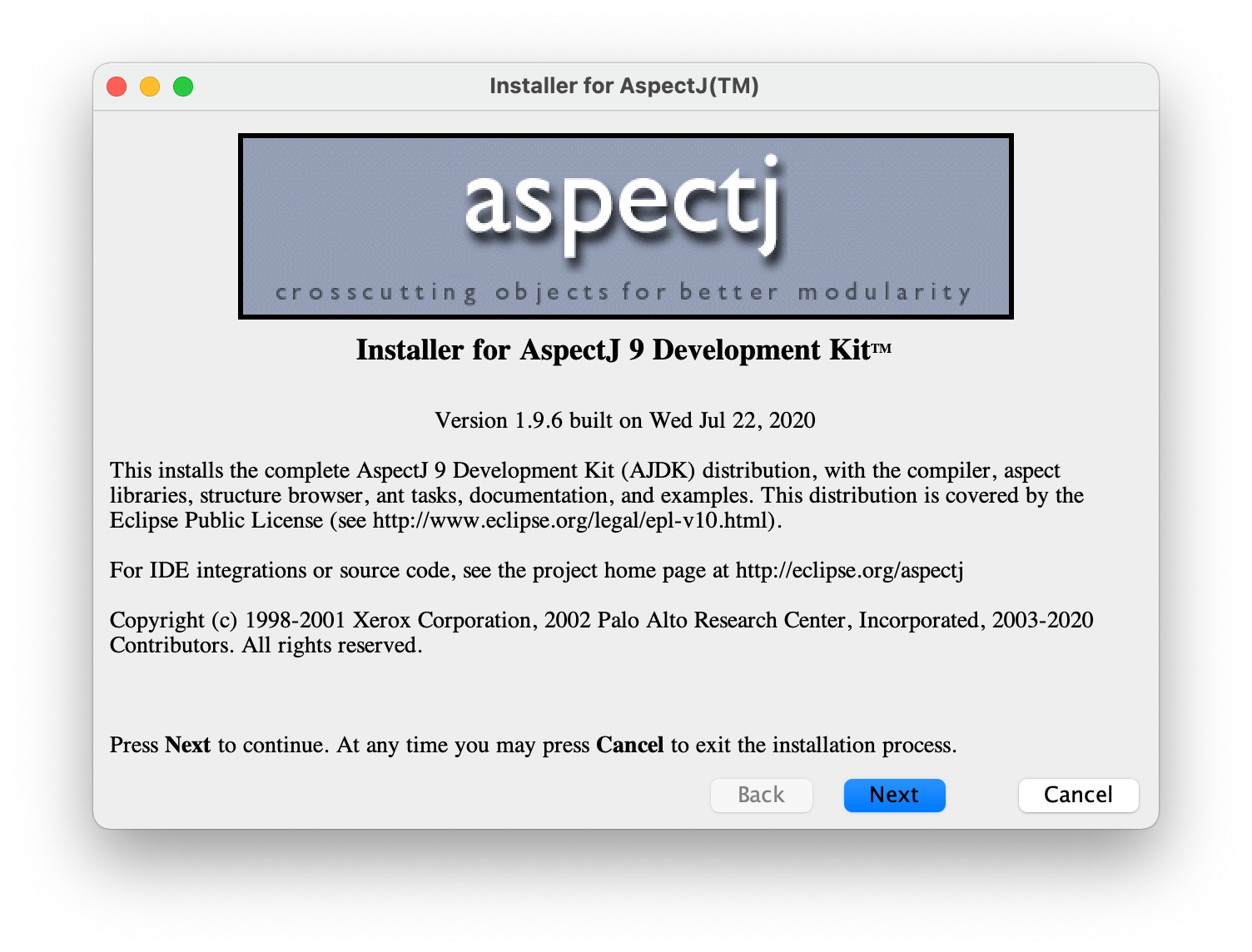 在官网^4下载最新版本的jar包,笔者这里的最新版本是aspectj-1.9.6.jar ,下载以后双击运行进行安装。
