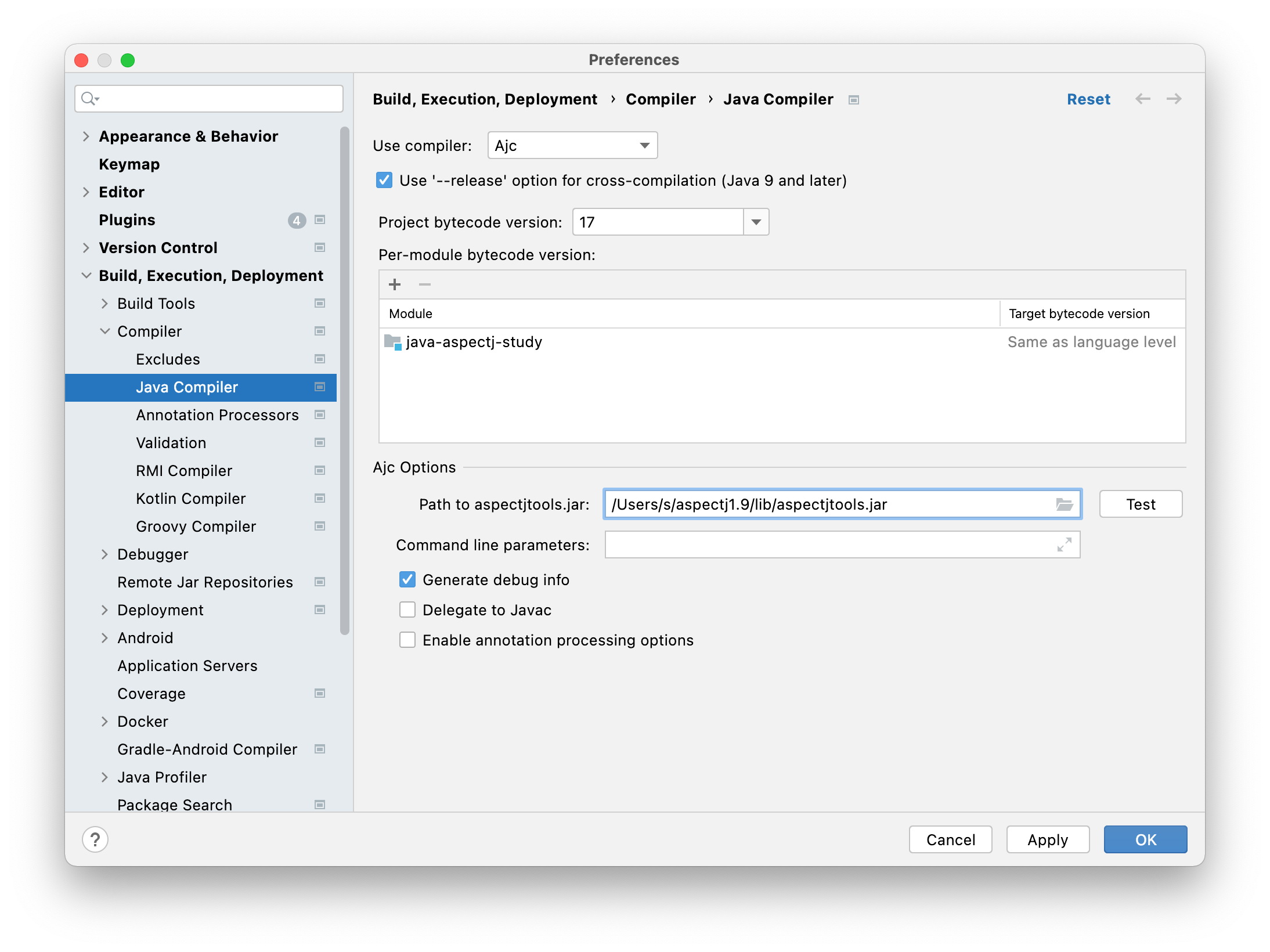 在IDEA的设置中选择AJC编译器,并指定1.2.1中安装的ajctool的位置。