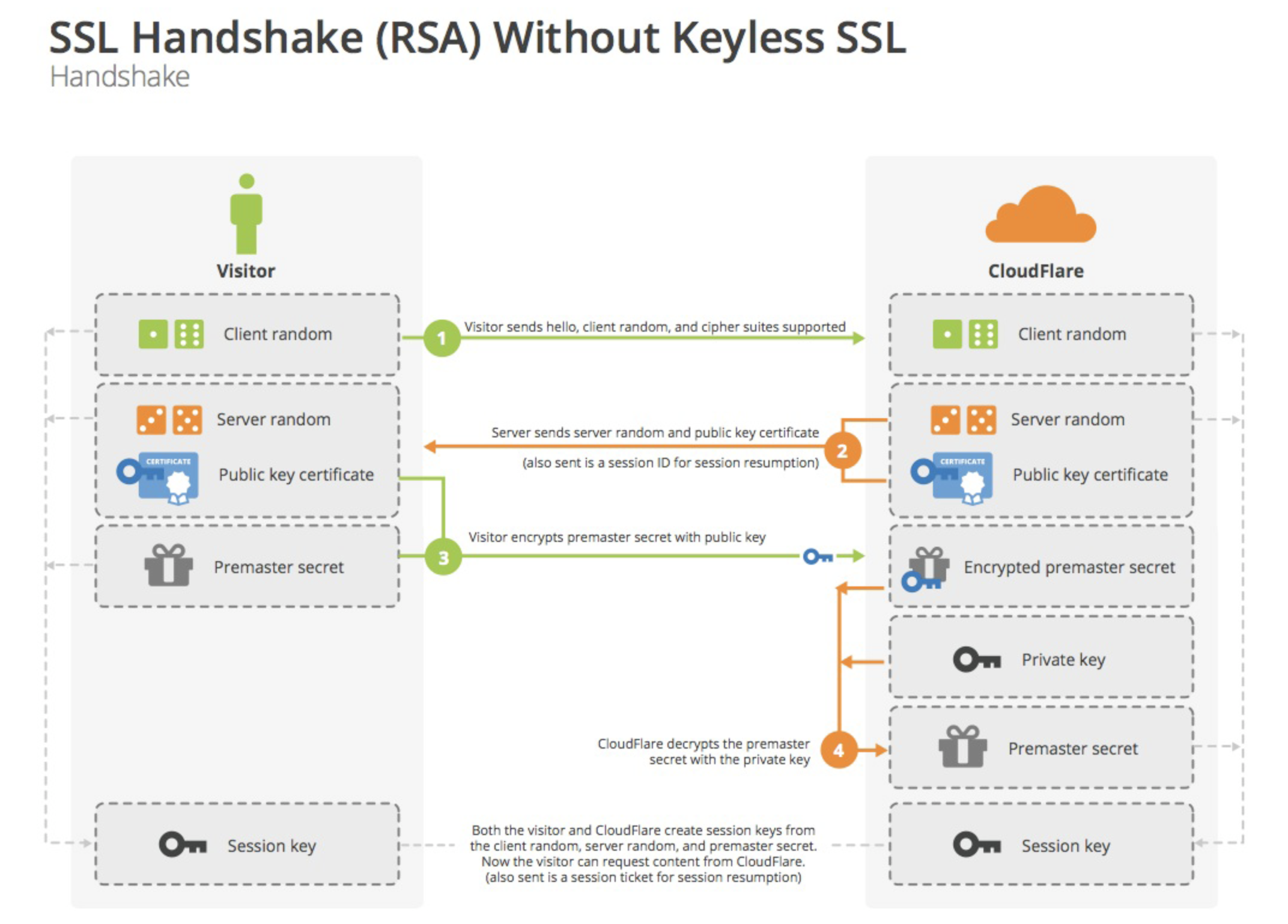 客户端请求SSL连接,发送一个随机数和客户端支持的加密算法,