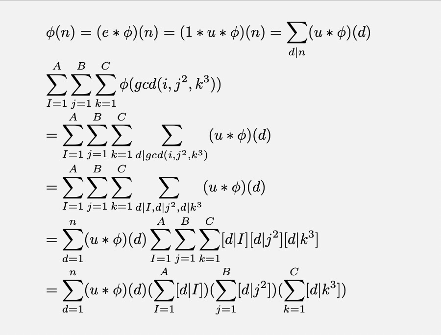 ans+=phu[i]*(a/i)*(b/f2[i])*(c/f3[i]);